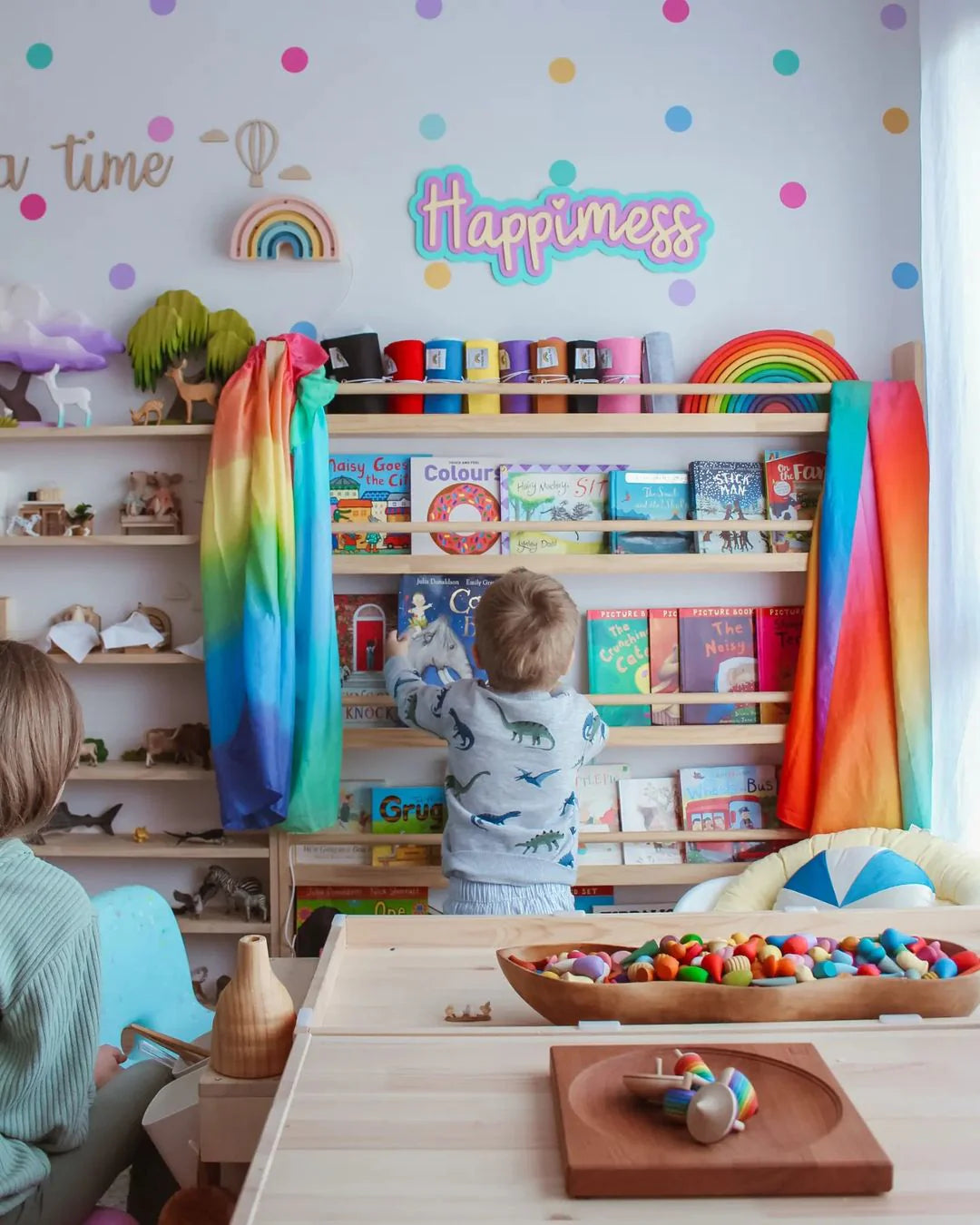 Une bibliothèque ou du rangement à sa hauteur encourage l’enfant à choisir ses livres et jouets seul et à développer son autonomie.